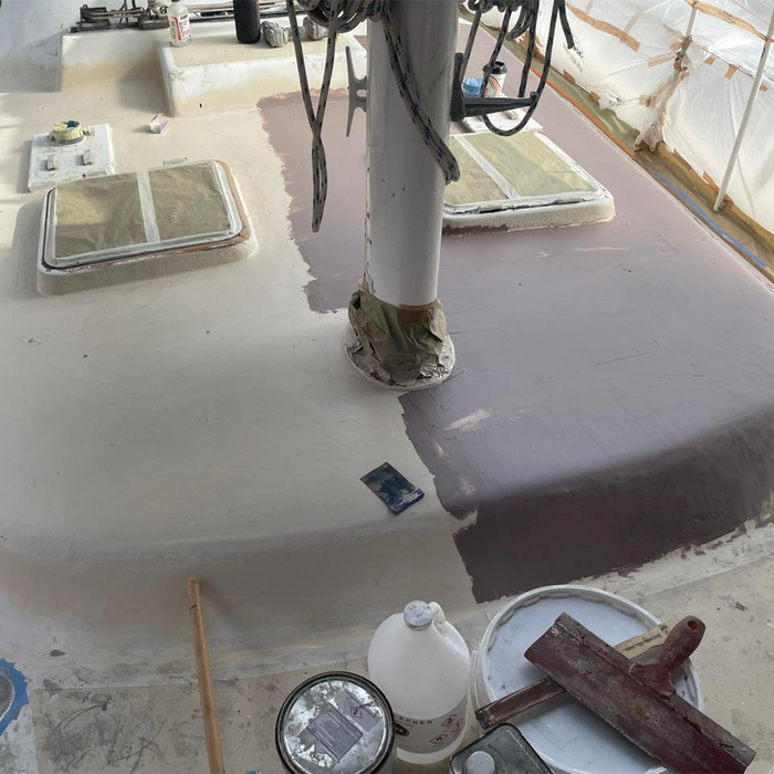 In addition to the deck reconstruction, fiberglass corrective work was performed on the hull to ensure proper surface alignment and finishing quality prior to final paint application.